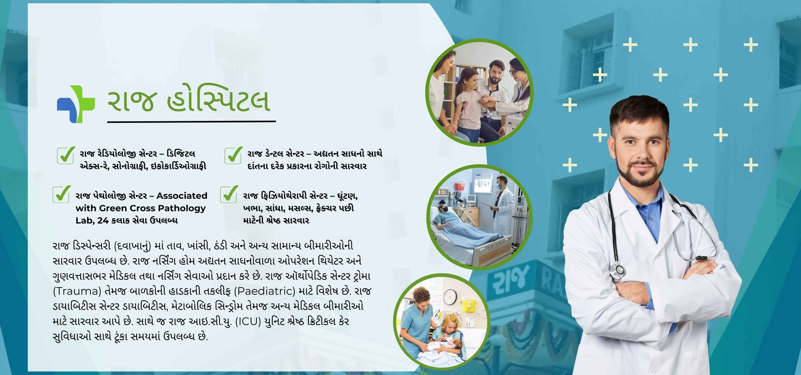 રાજ નર્સિંગ હોમમાં હોજરી, લીવર, આંતરડા તેમજ મૂત્ર માર્ગના રોગો, કિડની અને મૂત્ર માર્ગની પથરી, પ્રોસ્ટેટની સમસ્યા, હર્નિયા (સારણગાંઠ), મસા (હરસ/બવાસીર), હાઇડ્રોસિલ તેમજ દરેક પ્રકારની જનરલ સર્જરી માટે સચોટ નિદાન અને અસરકારક સારવાર પ્રદાન કરવામાં આવે છે.